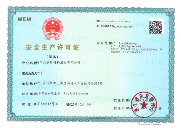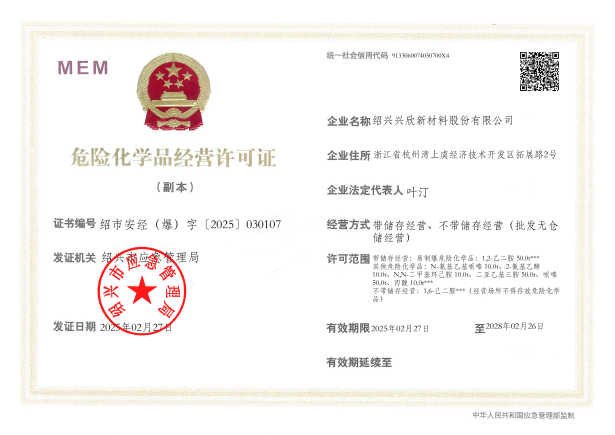 紹興興欣新材料股份有限公司成立于2002年06月27日,占地面積122畝,位于杭州灣上虞經(jīng)濟技術(shù)開發(fā)區(qū)拓展路2號,現(xiàn)有職工200余人,專業(yè)技術(shù)人員50余人;博士、碩士研究生30余人組成的一支知識型、專業(yè)化的技術(shù)科研團隊。公司面向全球市場,專業(yè)開發(fā)電子化學(xué)品、環(huán)保化學(xué)品、醫(yī)藥中間體、高分子材料等先進新材料重點領(lǐng)域的省級科技型企業(yè);建有浙江上虞、安徽東至兩個生產(chǎn)基地。目前為“國家高新技術(shù)企業(yè)”、浙江省“隱形冠軍”企業(yè)、浙江省專精特新中小企業(yè);建有“省級”研究開發(fā)中心,共建天津大學(xué)浙江紹興研究院電子化學(xué)品研發(fā)中心。